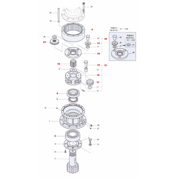 Planet Carrier Ass’y, Travel Gear Assembly, Swing Gear Assembly, Ring Gear, Swing Gear, Swing Shaft, Sun Gear, Center Shaft, Gear Drive/Gear Center, Shaft Pinion, Travel Motor Shaft, Planet Shaft, Planet Gear, RV Gear, Traveling Center Carrier, Center Shaft, Motor Shaft Gear, Travel Crank Shaft, Travel Motor Casing, Swing/Travel Pinion, Needle Bearing, Ball Bearing, Shaft Pin, HUB, Flywheel Gear Ring and etc.
