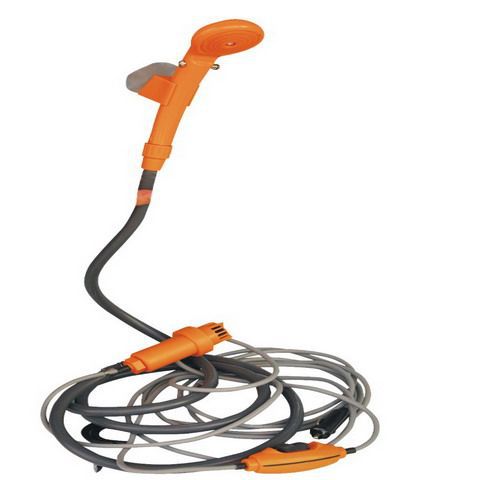 DC12 V automobile shower set Material: plastic Power supply: DC 12V battery, water flower:8L/min 12V car plug 4m cord,2m plastic hose Water power adjustable knob Electric pump with on/off switch Suitable all indoor and outdoor purpose with water bag ,Easy carry, convenience Inner packing: color box |