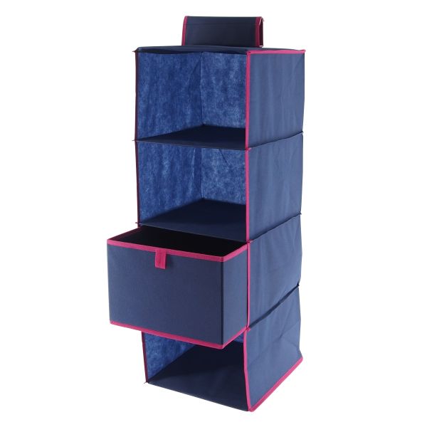 | Product | 4 Tiers Cloth Hanging Shelf with a Widen Strap, 1 Foldable Drawer For Closet Orangizer , Blue, Soft Closet Organizer |