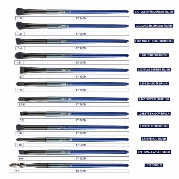 | 14 | L208 | Eye Shadow | 17.01 | 0.6 | Premium Synthetic Hair | Wood | Aluminum | Apply highlight shades on the inner corner of the eye |
