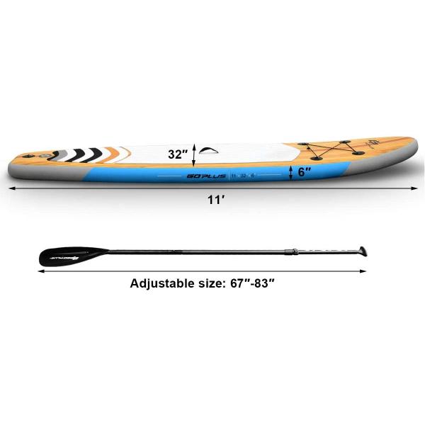 How can there be no surfing in summer? Take a look at our this paintedsurfboard! Built with quality material, this surfboard ensures better volume andbuoyancy. The sleek design reduces dragand allows for faster speeds, allowing you to have the fun easily. It alsocomes with a backpack that fits all accessories for easy carrying. How about have it for this summer? Features: 3 fins to help surfer gain controlled speed and maneuverability, 2 arefixed, and 1 is removable Aluminum and PP made paddle able to float on water for a better paddlesession Paddle is adjustable within 67" - 83" to meet your needs High density EVA material and drop-stitch construction that bears upto 265lbs with strong buoyancy performance With bungee ropes to keep your items on the surfboard safer Connector for ankle leash (not included) that helps you stand morestable on the board Takes about 6 minutes to inflate the surfboard Backpack that fits all accessories is included for easy carrying Specifications: Material: EVA, PP Color: Blue Product Dimension: 11' × 32" × 6" Product Weight: 20 lbs Weight Limit: 265 lbs Paddle (Adjustable): 67" -83" Package Include: 1 × InflatablePaddle Board 1 ×RetractablePaddle 1 ×Pump 1 ×CarryBackpack 1 ×Fin 1 ×RepairKit 1 ×Instruction