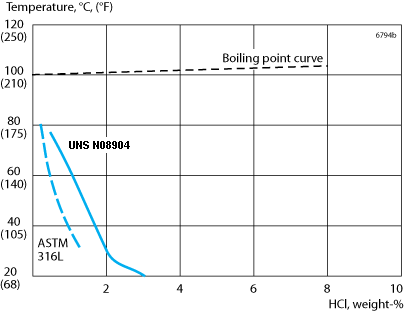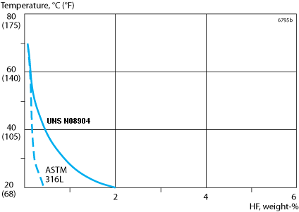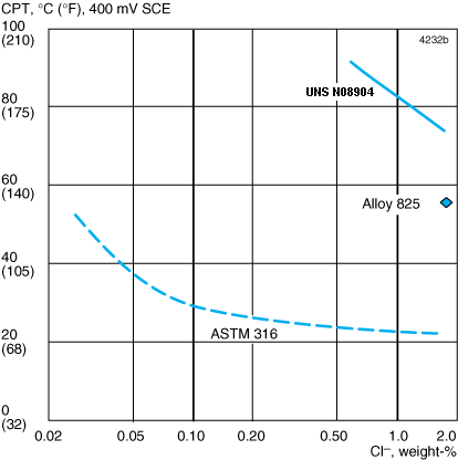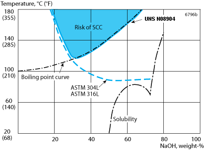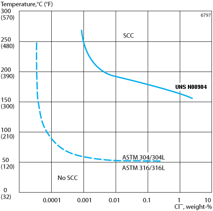 As can be seen the risk of stress corrosion cracking (SCC) increases at high temperatures. This risk is enhanced if chlorides are present. The alloy UNS N08028, see data sheet S-1885-ENG, provides better resistance against SCC and also general corrosion than is the case for UNS N08904.