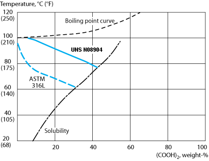 In pure acetic acid, both UNS N08904 and AISI 316L are completely resistant at all temperatures and concentra-tions at atmospheric pressure. At elevated temperatures and pressures, however, AISI 316L will corrode while UNS N08904 will remain resistant. Experience from acetic acid production has shown that acetic acid contaminated with formic acid is always corrosive. In acid of this kind, UNS N08904 is far more resistant than AISI 316L, see table 1 below. Practical operating experience has confirmed the superiority of UNS N08904 to AISI 317L as well.