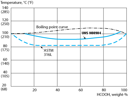 In formic acid, high-alloy UNS N08904 shows better resistance than conventional steels of the AISI 316L type, see figure 3. In oxalic acid UNS N08904 shows better performance than 316L, see figure 4. UNS N08904 is resistant (corrosion rate <0.1 mm/year) in lactic acid at all concentrations at temperatures up to or slightly below the boiling point at atmospheric pressure. This means a corrosion resistance similar to or slightly better than of 316L in lactic acid. Due to its molybdenum content, UNS N08904 is less resistant to nitric acid than steels of the AISI 304L and AISI 310L types, which are commonly used in these environments.