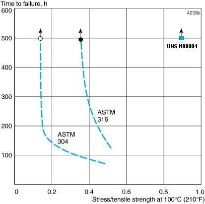 Figure 10. SCC resistance of UNS N08904 in comparision to AISI 304 and AISI 316 types of steels in neutral aerated chloride environments.