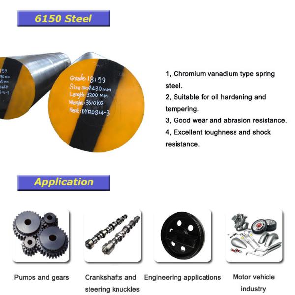 It’s commonly used in heavily stressed machinery parts including shafts, gears, pinions and also in hand tool components. ASTM 6150 steel is also widely in the motor vehicle industry AISI 6150 is suitable for many general engineering applications that require high tensile strength and toughness.