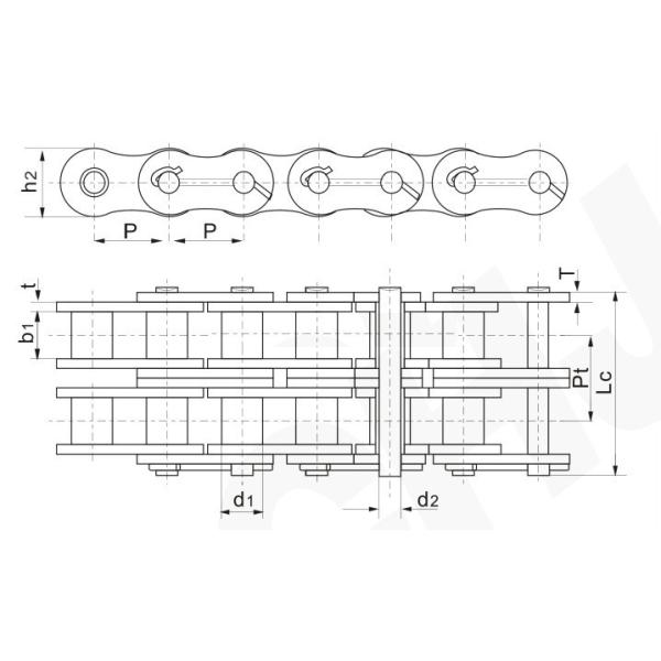 | DIN ISO Chain No. | ANSI Chain No. | Pitch | d1 max mm | b2 max mm | d2 max mm | h2 max mm | t/T | Pt mm | Lc max mm | U.T.S KN | A.T.S KN | q ≈ kg/m | |