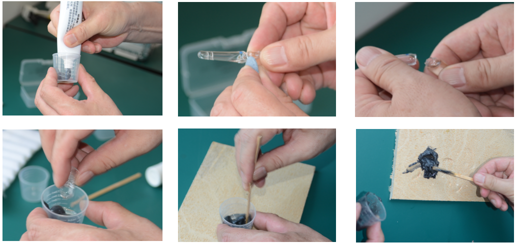the hardener into the mixing box, mix the silicone rubber and the hardener well quickly, apply the mixture on the traces. After hardening is complete (about 10 minutes), lift the cast.