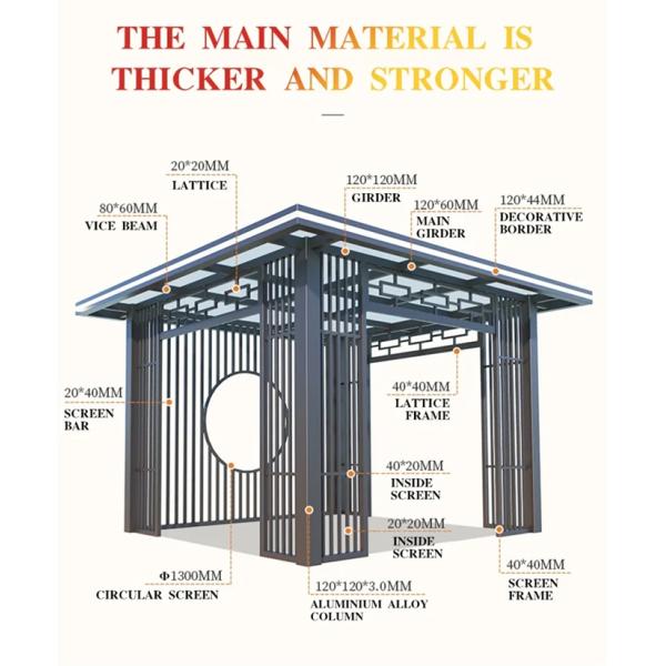| Outdoor aluminum pavilion Application | Courtyards, tourist attractions, resorts, parks, leisure places |