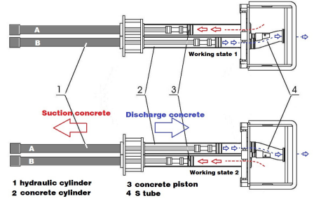 Working state 1: A cylinder suction, B cylinder discharge concrete;