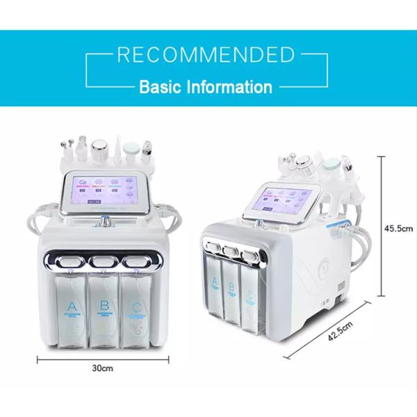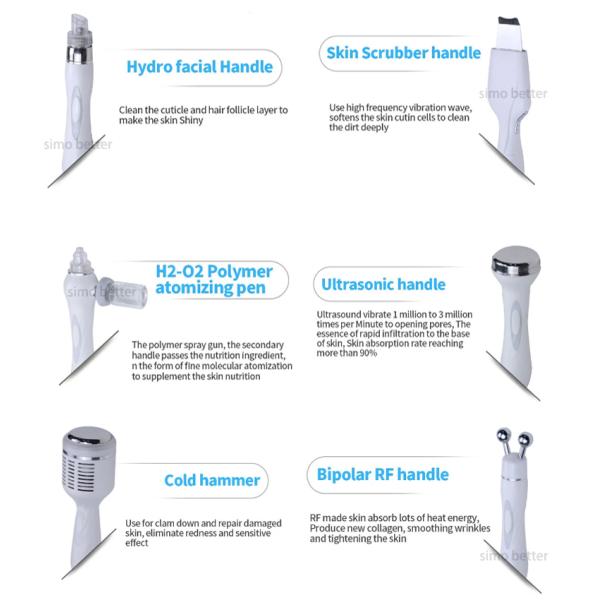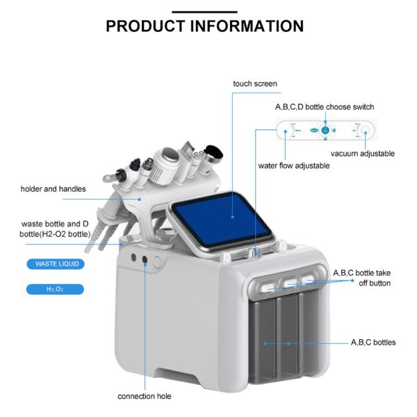 This is newest facial skin care machine using H2O2 generator make the purified water into hydrogen and oxygen ions water,the surface of the skin can produce H2 molecules, so that the water molecule cells can quickly penetrate the dermis. So as to achieve the effect of skin rejuvenation and whitening, give you a fresh face ! The new product is the multi-functional beauty equipment. It has six function handles which can tighten skin, removal acne, removal blackhead, freckle removal, tender skin whitening, moisturizing and clean skin. Hydro dermabrasion utilizes the natural healing powers of water and oxygen to effortlessly exfoliate the skin without the use of hard crystals or abrasive textured wands, generating deeply hydrate.