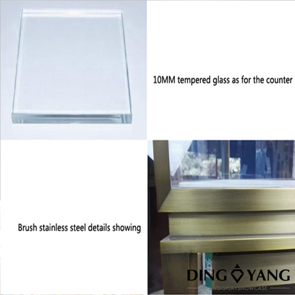 This Stainless Steel Lockable jewellery shop counter furniture Is Finished By Bronze Electroplating, The Standard size is 1200X550X950MM and can be customized other size as you need, 10MM clear tempered glass panels on top and all sides. Led strip lights hidden in the stainless steel frame. The lights can be 2700K~6500K ( with low power consumption lights), Each glass jewellery counter has installed the reducer that hidden under the stainless steel Lockable jewellery counter. You can use it right away while you recevied the products.We are the jewellery counter factory in GuangZhou China, we offer the jewellery counter designs and custom service.