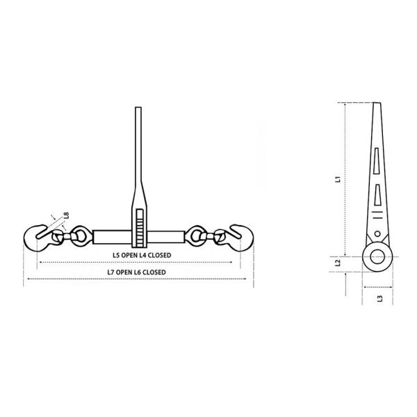 | Min-Max Chain Size (in.) | Working Load Limit (lbs) | Proof Load (lbs) | Minimum Ultimate Load (lbs) | Weight (lbs) | Handle Length (in.) | Dimensions (in.) | |||||||