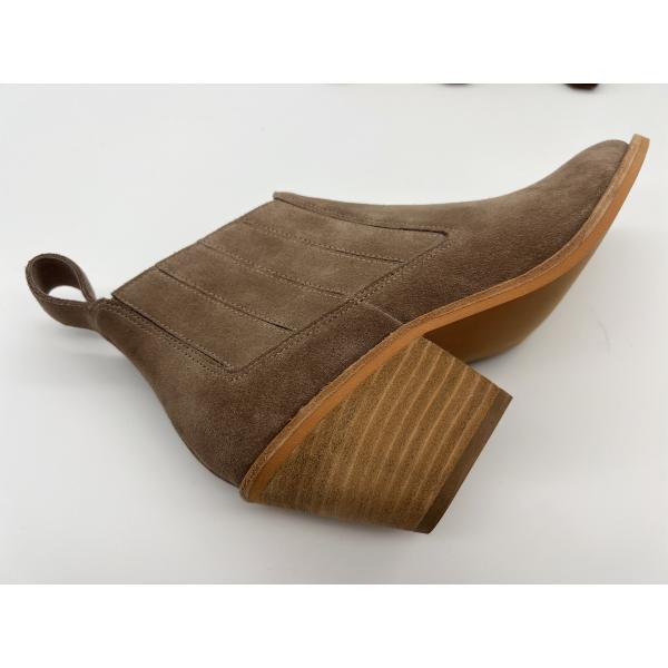 soft cow suede leather with high quality gore design,1.5 mm raw edge folded with decorate stitching in upper,back tab with folded upper design, brushed real natural stack wrapped with abs heel, TPR outsole with pusable latex and two -tone brushed welt