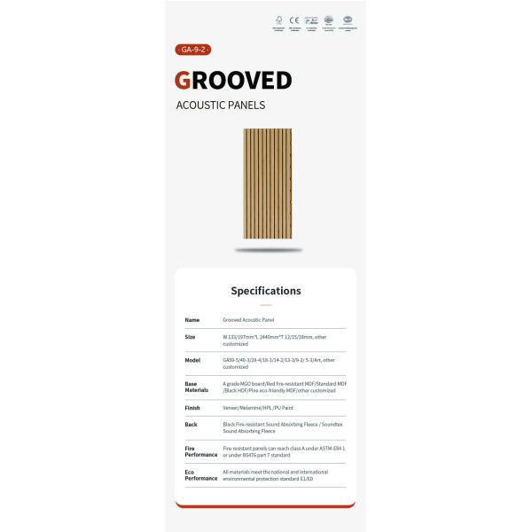 Enhanced Sound Absorption: Grooved wood acoustic panels feature a specially engineered groove structure that significantly increases the contact area between sound waves and the material. This innovative design enhances sound absorption, minimizes echo and noise, and contributes to a quiet, comfortable acoustic environment. With a noise reduction coefficient (NRC) of 0.9, these panels are particularly effective at absorbing low and mid-frequency sounds.