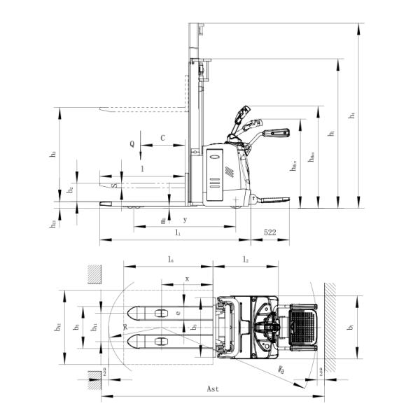 | Mast Types | Lift Height h3+h13(mm) | Height,mast lowered h1(mm) | Free Lift h2(mm) | Height,mast extended h4(mm) |