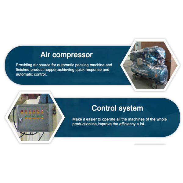 | Semi-automatic type | 6-8t/h | 50-60㎡ | 6-8m | 3-4 Person | Manual batching Automatic packaging |