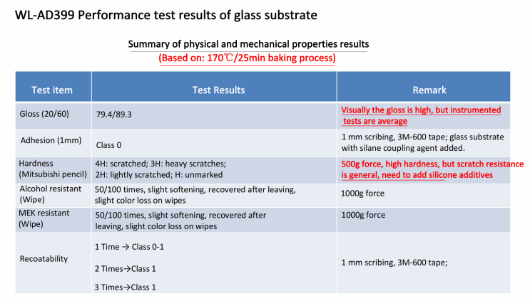 WL-AD399 is specifically developed for use in baking paints on glass substrates.